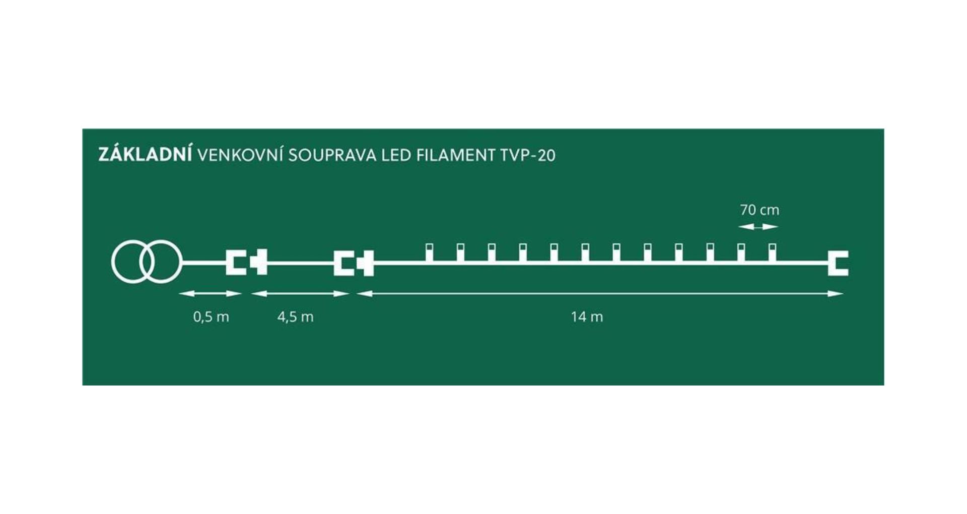 Souprava se skládá z vlastního osvětlovacího řetězu o délce 14 m a SELV bezpečného IP 44 napájecího transformátoru 230V/20V s výkonem 20VA s přívodním kabelem 5 m.